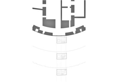 A descent from the papal chambers atop the structure to observe the shaft reinforces this idea of occupying an interstitial place. Ambient light let in through polycarbonate windows illuminates the intervention but robs the occupant of any context aside from the immediate presence of the layered wall and the view of the Vatican to the left. The tensile construction contrasts with the heavy mass of rammed earth at the center of the intervention. Perhaps most bluntly, two seperate systems are at work. There is the skin of the facade, made of modern materials and informed by a grid derived from the windows of the papal chambers, the most recent addition to the building. On the interior, rammed earth and timber beams reference traditional methods of Roman scaffolding, and derive their geometry from the angles present within the excavated shaft. The old and the new, although separate, begin to mesh together and become one. The scholar is everywhere and nowhere at the same time.